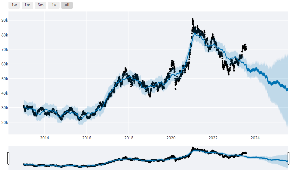 META Datascience Team의 시계열 분석 도구로 예측된 주가 예측 결과를 확인합니다.